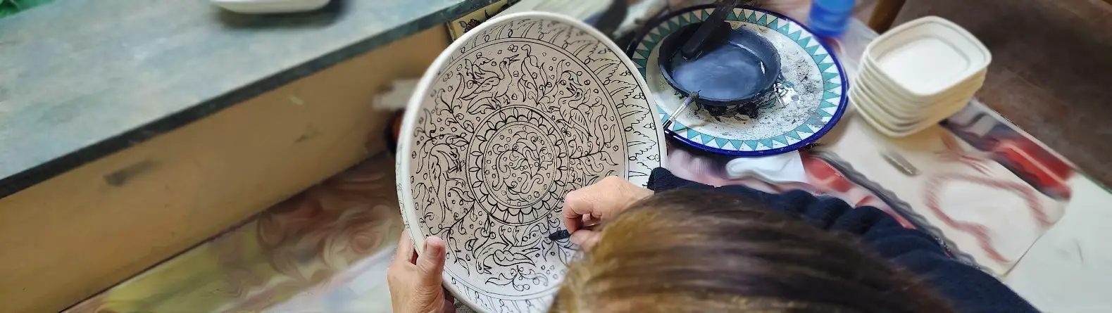 Watch the hand painting of a large fruit bowl or serving bowl by Nanor Balian & painter Khatoun. The bowl is then sprayed with a glaze and fired to more than 1000 C in a ceramic kiln.